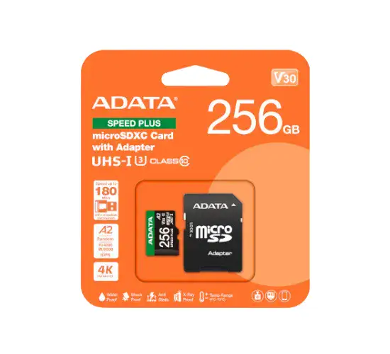 כרטיס זיכרון ADATA Speed Plus אידיאלי למצלמות ומצלמות אבטחה (תומך באיכות 4K), מהירות קריאה וכתיבה UHS-I U3 Class 10 V30 A2 עד 180/160MB לשנייה.